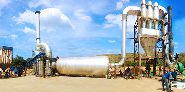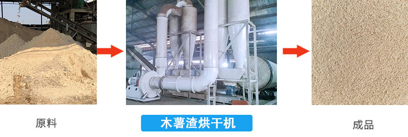木薯渣烘干機主要由供熱源、進料機、回轉滾筒、出料機、引風機、卸料器和配電柜構成;脫水后的濕木薯渣進入木薯渣干燥機后,在滾筒內均布的抄板翻動下,在烘干機內均勻分散與熱空氣充分接觸,加快了烘干傳熱﹑傳質。在烘干過程中,木薯渣在帶有傾斜度的抄板和熱介質的作用下,至烘干機另一段排出烘干成品。生產線的工藝參數和各設備技術參數及結構的選取和設計是在經過對木薯渣物料的認真分析研究才得出,并經過實際木薯渣烘干試驗的驗證。在方案設計當中、充分考慮到木薯渣水分含量大、蛋白含量高、粘性大的特點,并采取了一系列新技術和工藝來加以解決,以確保良好的烘干效果。